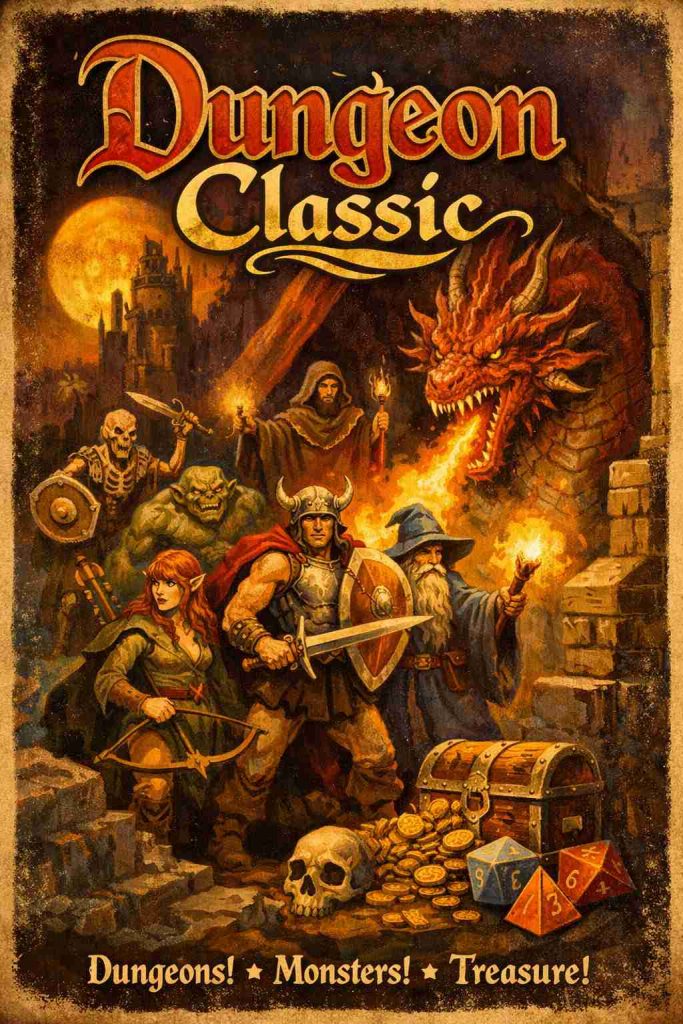 Dungeon Classic: Roguelike de Mazmorras Retro con Portada Años 70 y Letras Arcoíris 🌈🧙‍♂️🔥