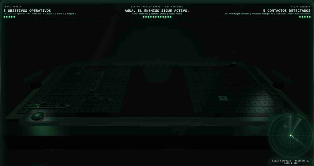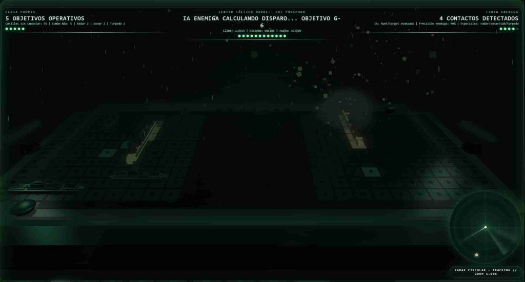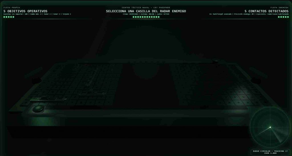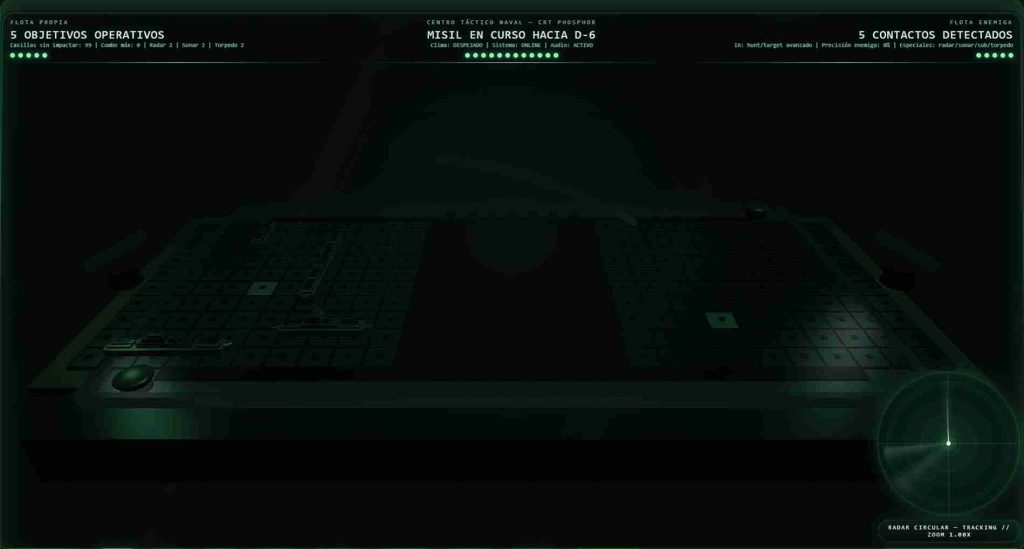Hundir la Flota CRT Babylon v2.1 lleva el clásico de siempre a otro nivel con una puesta en escena espectacular: estética CRT fósforo verde, radar táctico, misiles con arco, torpedos físicos, explosiones masivas, humo, fuego por fases y una ambientación de consola militar arcade que hace que cada partida se sienta intensa y adictiva.