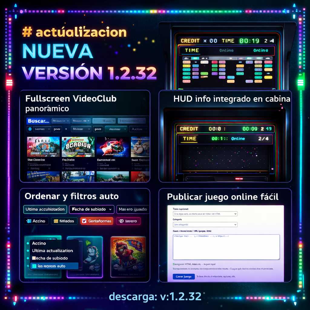 🌈 Qué trae esta versión (v1.2.31) Esta versión no es simplemente una pequeña actualización técnica. Es un paso más en la evolución del proyecto RGB VideoClub como sistema completo de catálogo, experiencia y ambientación arcade. ✅ Fullscreen “RGB VideoClub” Ahora, al pulsar el botón de fullscreen del catálogo, se abre una pantalla completa estilo videoclub