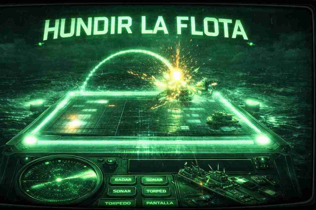 ⚓ HUNDIR LA FLOTA CRT BABYLON v2.1 🟢 La recreativa naval definitiva Hundir la Flota CRT Babylon v2.1 lleva el clásico de siempre a otro nivel con una puesta en escena espectacular: estética CRT fósforo verde, radar táctico, misiles con arco, torpedos físicos, explosiones masivas, humo, fuego por fases y una ambientación de consola militar