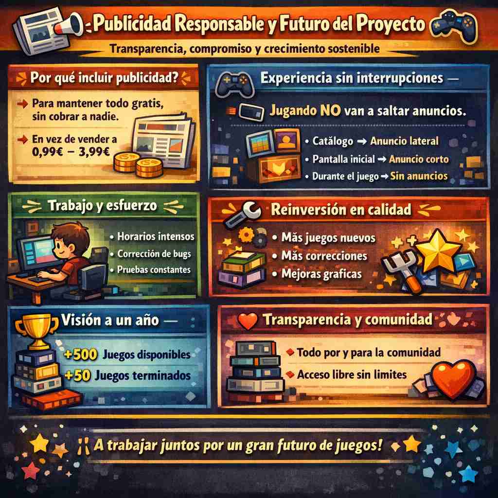 Sobre la Publicidad y el Futuro del Proyecto 📢 Publicidad Responsable y Futuro del Proyecto 🎮 Transparencia, compromiso y crecimiento sostenible 💡 ¿Por qué incluir publicidad? 📰 Hola. El motivo de incluir anuncios, similares a los que aparecen en páginas web informativas o periódicos digitales, es algo completamente fundamental para que el proyecto pueda seguir