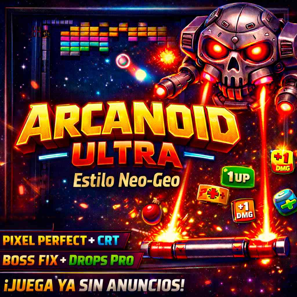 🎮 ¿Qué se ve en el vídeo? En el vídeo muestras ARCADNOID ULTRA (Estilo Neo-Geo) en acción: un brick breaker rápido y súper arcade donde cada rebote cuenta. Se aprecia el pixel-perfect (todo nítido, sin blur), el look CRT (sensación recreativa) y una presentación muy “90s” con explosiones, brillo y energía visual. 💥🧱✨También se nota